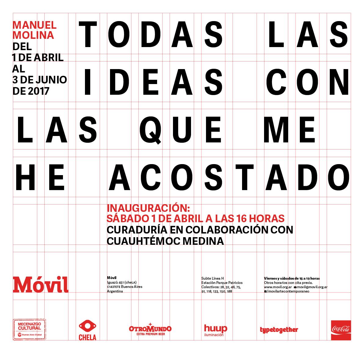 El sábado 01 de abril a las 16 hs se inaugura la primer muestra de Móvil del ciclo 2017: "Todas las Ideas con las que me he acostado" de Manuel Molina; una obra curada en colaboración con Cuauhtémoc Medina.