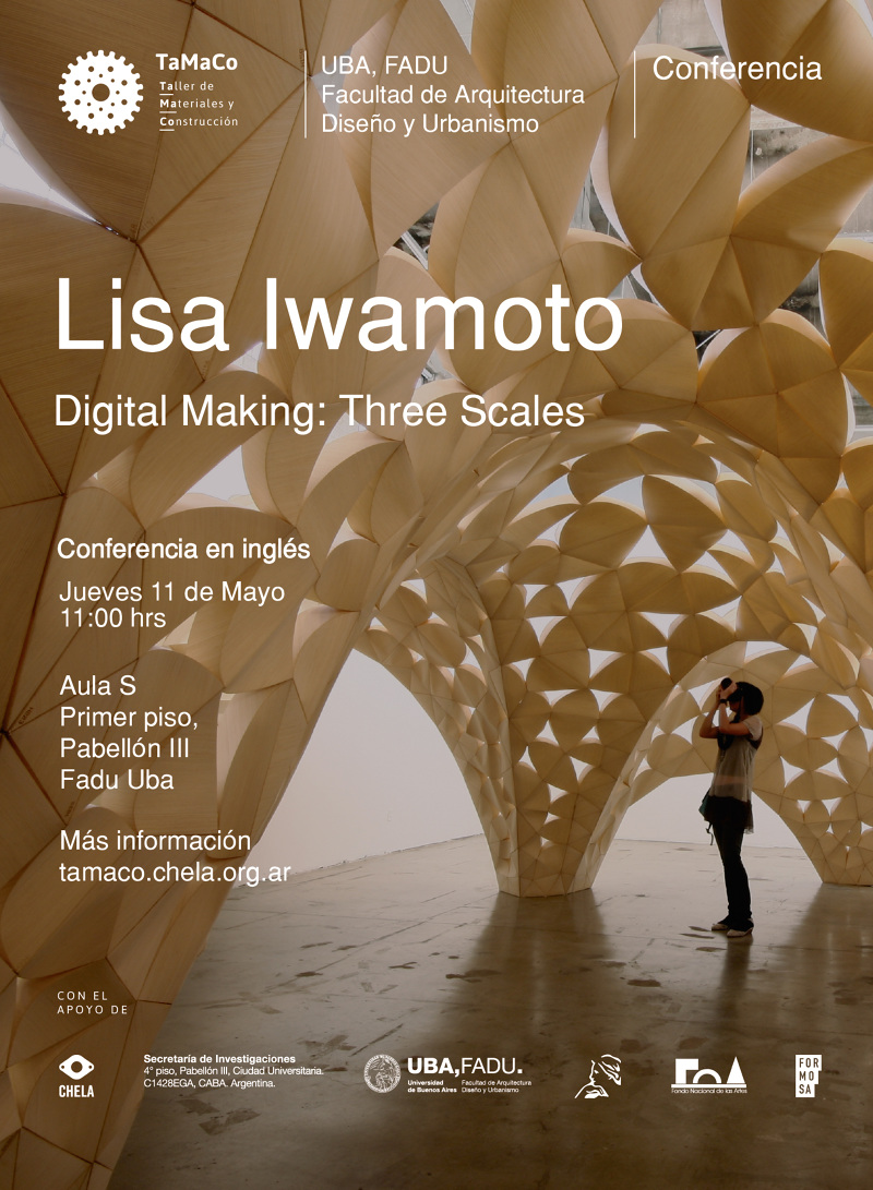 TaMaCo-cheLA, en conjunto con la Secretaría de Investigaciones, FADU, UBA Laboratorio +ID y con el apoyo de la Beca a la Formación del Fondo Nacional de las Artes, se complace en dar la bienvenida a Lisa Iwamoto para dar una conferencia sobre su trabajo, el próximo jueves 11 de Mayo a las 11:00 am en el Aula S primer piso, pabellon III, FADU UBA.