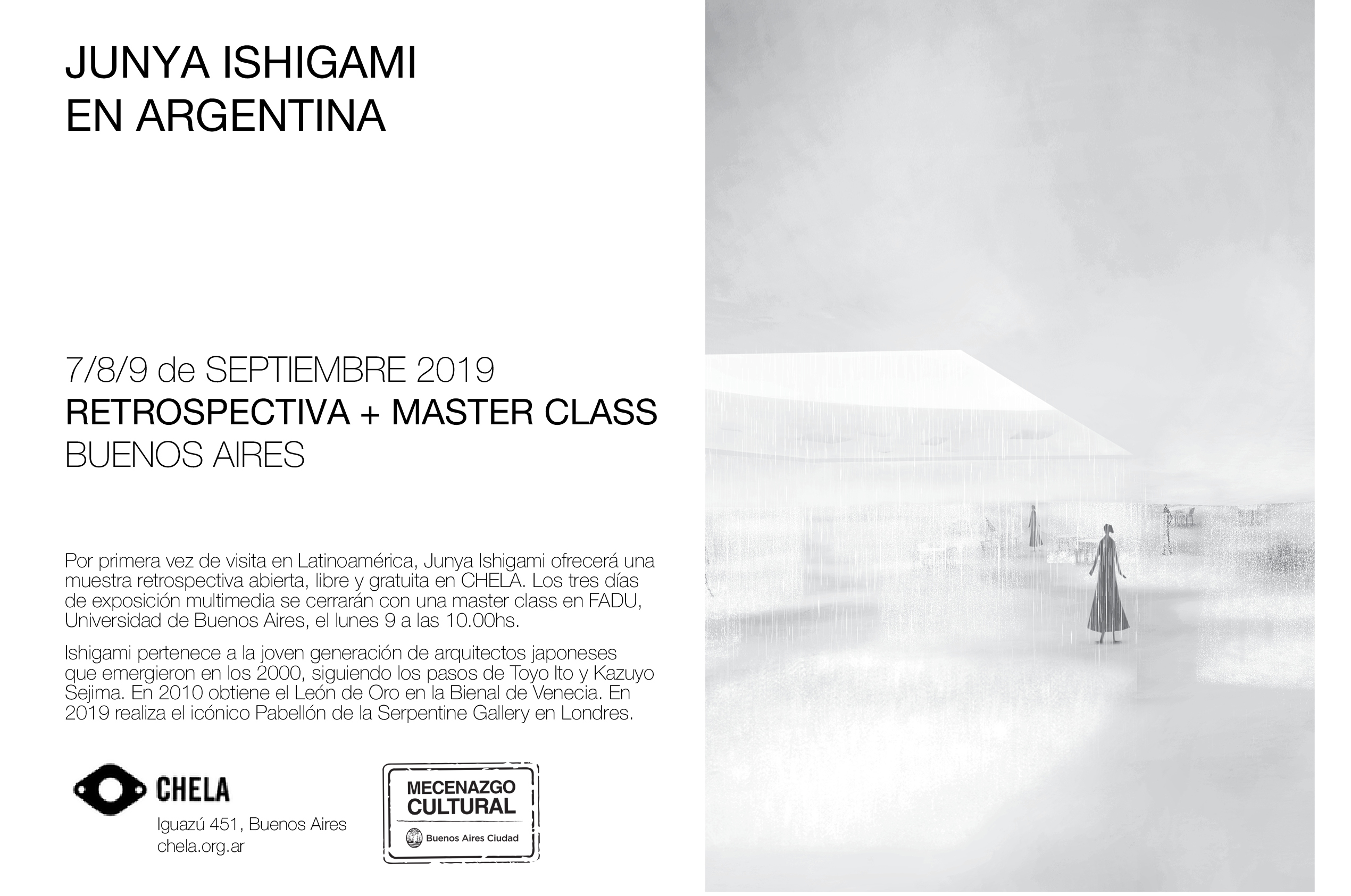 cheLA se complace en traer -por primera vez en su visita a Sudamérica- al reconocido Arquitecto japonés Junya Ishigami. Durante su visita se llevará adelante una Retrospectiva de la obra del Arquitecto que se ofrecerá en cheLA durante los días 7, 8 y 9 de septiembre de 17 a 21hs.
